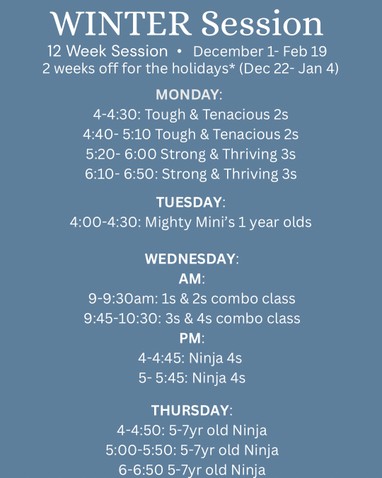 45 minute class. This 4 year old class is designed for maximizing strength, agility and tumbling. We will focus on learning gymnastics skills (cartwheels, rolling, bridging) however it will be a fast paced class focusing on overall body strength and coordination! If you're seeking a class to increase strength, coordination and tumbling while getting your child tired out this class is for you! $170/ 10 week session